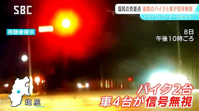 塩尻市の交差点で複数のバイクと車が信号を無視して危険走行する様子を、視聴者のドライブレコーダーが捉えました。富山県では今月7日、赤信号を無視した車による死亡事故も起きています。