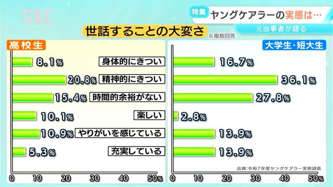 県が高校生と大学生などを対象に行ったヤングケアラーの実態調査では、家族を世話する大変さについて「精神的にきつい」という回答の割合が高くなっています。
