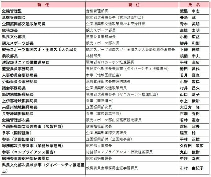 長野県職員人事異動2026【名簿一覧掲載】 部課長級 部長級は48人 課長級は304人 女性の登用は部長級が14人 課長級が100人 2026年3月19日(木) 16:18 国内 部課長級① 危機管理監 渡邉卓志氏 危機管理部長 矢島武氏 企画振興部交通政策局長 青木英明氏 総務部長 高橋寿明氏 県民文化部長 小池広益氏 観光スポーツ部長 柳井和則氏 観光スポーツ部国スポ・全障スポ大会局長 下條伸彦氏 農政部長 根橋幸夫氏 建設部リニア整備推進局長 平林高広氏 監査委員事務局長 池田昌代氏 人事委員会事務局長 若月真也氏 労働委員会事務局長 小野政仁氏 議会事務局長 村井昌久氏 諏訪地域振興局長 山口恭子氏 上伊那地域振興局長 水上俊治氏 南信州地域振興局長 大日方隆氏 長野地域振興局長 百瀬秀樹氏 危機管理部次長 若林憲彦氏 企画振興部次長兼参事 塩原昭夫氏 参事(国際担当) 稲玉稔氏 参事(全国知事会) 平林正枝氏 総務部次長兼参事(業務改革担当) 久保田敏広氏 参事(コンプライアンス担当) 丸山俊樹氏 総務参事兼総務部秘書課長 中坪幸恵氏 県民文化部次長兼参事(ダイバーシティ推進担当)市村由紀子氏 健康福祉部次長 藤木秀明氏 環境部次長兼参事(ゼロカーボン推進担当)水野恵子氏 環境部次長兼参事(地酒・食品振興担当)兼参事(人材確保・育成担当) 木下育夫氏 観光スポーツ部次長 小山浩一氏 林務部次長 重野靖氏 参事(県土のグランドデザイン担当) 笠原隆通氏 企業局次長兼経営推進課長 室賀荘一郎氏 林務部長 千代登氏 建設部長 森下淳氏 農政部次長 片井基典氏 建設部次長 増澤邦彦氏