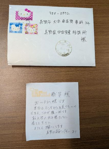 封筒には、職員あての手書きの手紙が添えらえれていて、「お疲れ様です。本当はランドセルを送りたいのですが、これが精一杯です。新入学のお子様たちに渡して下さい。よろしくお願いします。長野の仮面ライダーより」と書かれていました。