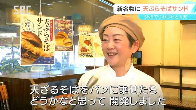 神戸屋ブレッズ諏訪湖SA店 田子綾華店長「中国から来て、初めて日本でざるそば食べたらものすごく好きで、天ざるはもう一番好物。上司から新しいパンを開発してもらえませんかって言われて、家で悩んだ、悩んだ末にね、信州は元々そば有名なんで、それだったらインパクトあるもの。天ざるそばをパンにのせたらどうかなってと思って開発しました」
