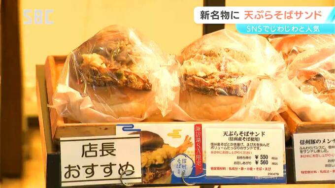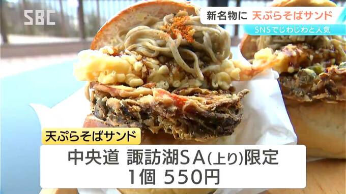 中央道上り線の諏訪湖サービスエリア。その一角にある店先で特に目を引くのが、その名も「天ぷらそばサンド」です。