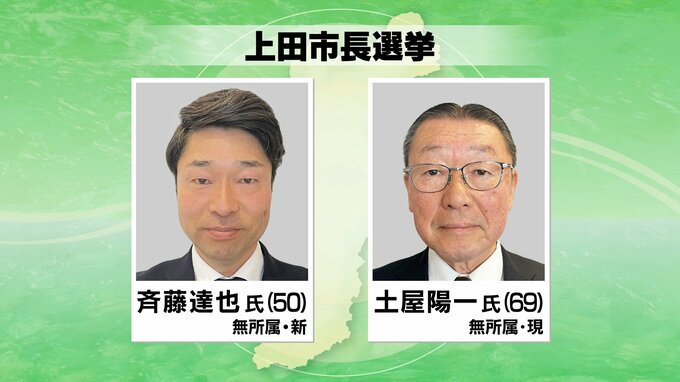 上田市長選に立候補したのは、届け出順に、新人で元市議会議員の斉藤達也さん50歳と、現職で3期目を目指す土屋陽一さん69歳のいずれも無所属の2人です。