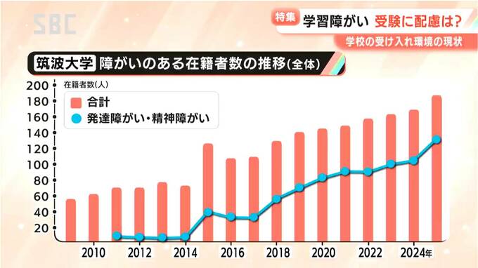 ニュースワイド特集 「漢字だけが極端に苦手。でも大学で学びたい」発達障がいの「合理的配慮」とは?学習障がいがある受験生を通じて考える 専門部署をつくり対応にあたる大学の取り組み 2026年4月4日(土) 06:00 国内 専門部署をつくり対応する大学の取り組み 筑波大学では、障がいのある学生も積極的に受け入れています。 中でも、発達や精神に障がいのある学生は増加傾向で、専門の部署をつくり、対応にあたっています。