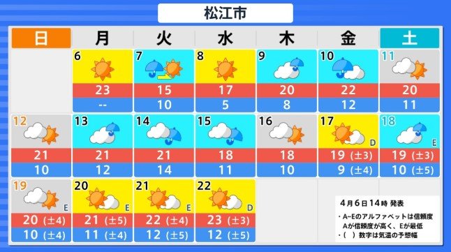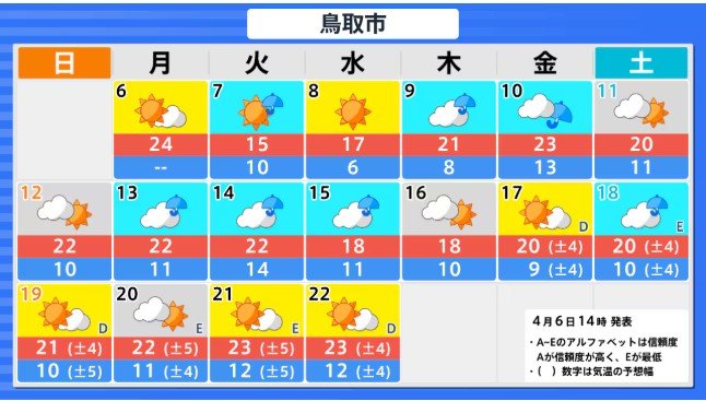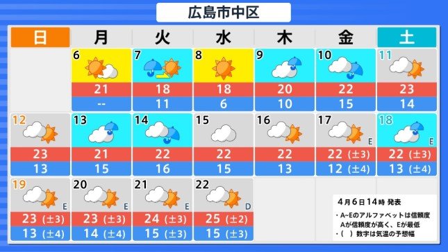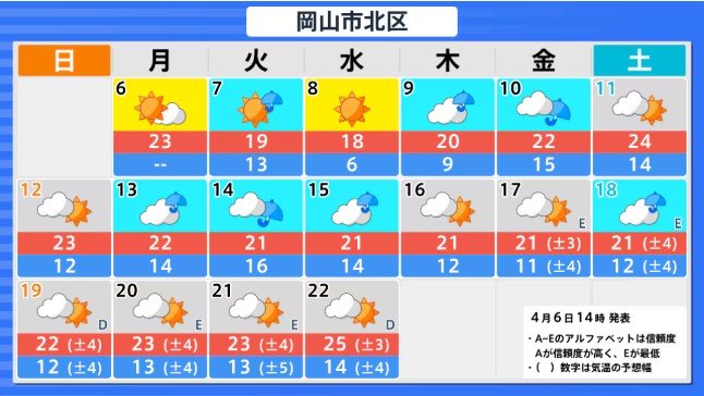 中国地方の向こう2週間の気温は、暖かい空気が流れ込みやすいため高い日が多く、10日頃からはかなり高くなるでしょう。農作物の管理等に注意してください。