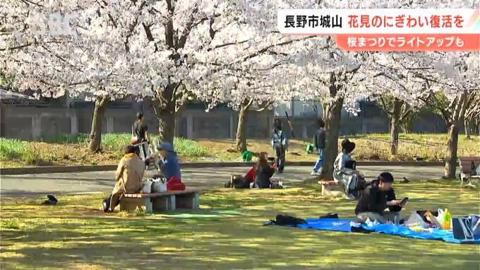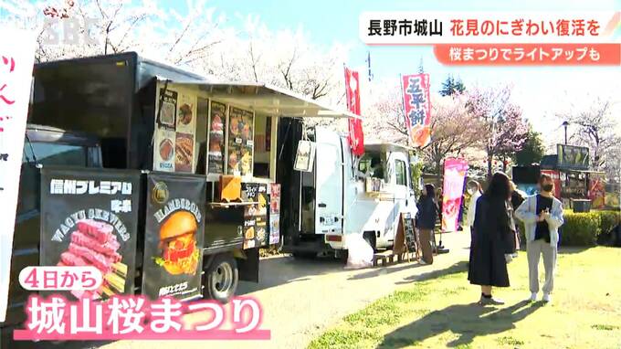 長野市の城山公園。例年より早く桜が満開を迎えました。天候に恵まれた8日は、大勢の人がお花見を楽しみました。公園では、4日から「城山桜まつり」が始まり、キッチンカーなども並びます。