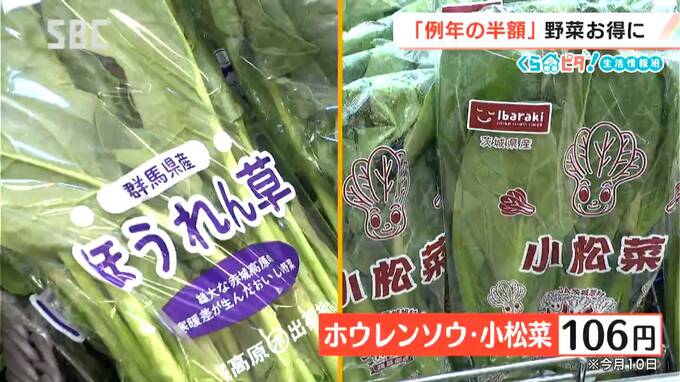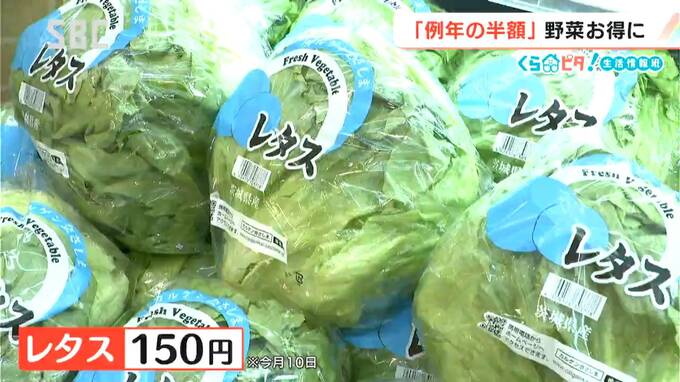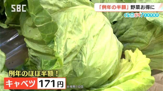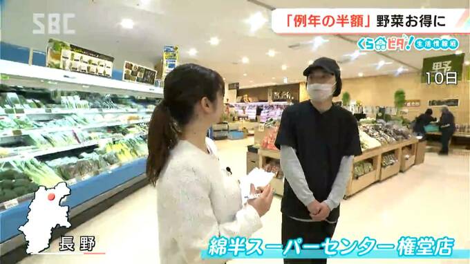 綿半権堂店青果担当 羽生輝さん:「今年の天気の影響で、葉物類、レタスやキャベツ、ホウレンソウ、小松菜などがお安くなっています。キャベツは例年の半額ほどの値段となっています。ここ1か月ぐらいで大きく値段が下がってきたかなという感じ。自分も(青果担当の)経験3年目ぐらいですが初めてのことです」