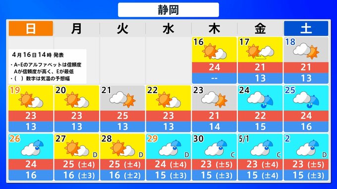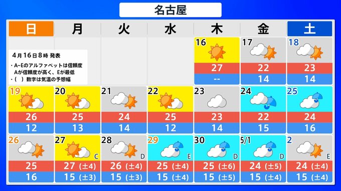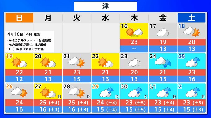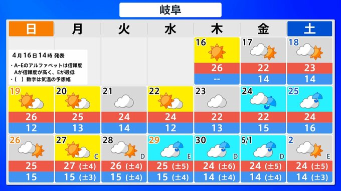 東海地方の向こう2週間の気温は、暖かい空気に覆われやすいため高く、21日頃からはかなり高くなる見込みです。農作物の管理等に注意してください。