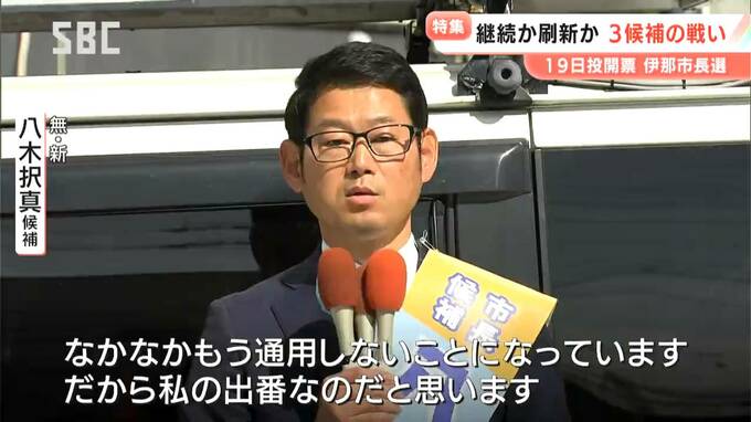 八木択真候補:「地方の課題は非常に複雑化しています。行政だけではどうにもできない部分がある。民間も巻き込んでいかないと今までの市役所の手法では、なかなかもう通用しないことになっている。だから私の出番なんだと思います。必ず結果を出す、伊那市再起動です、そろそろ次行きましょう」