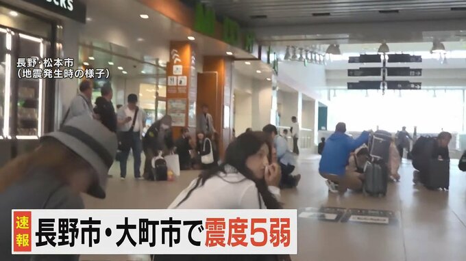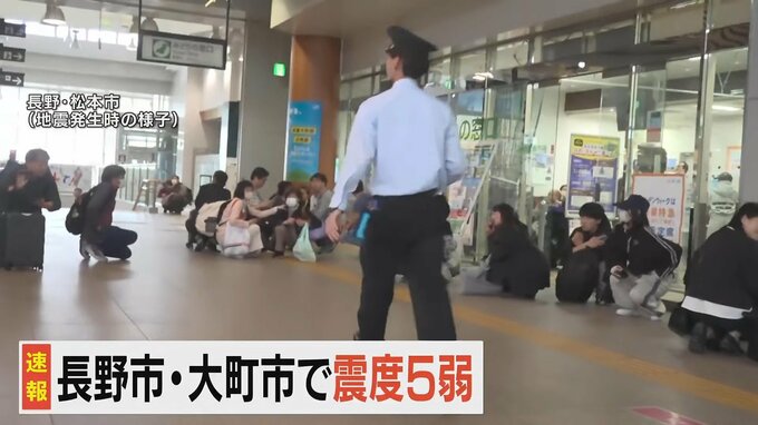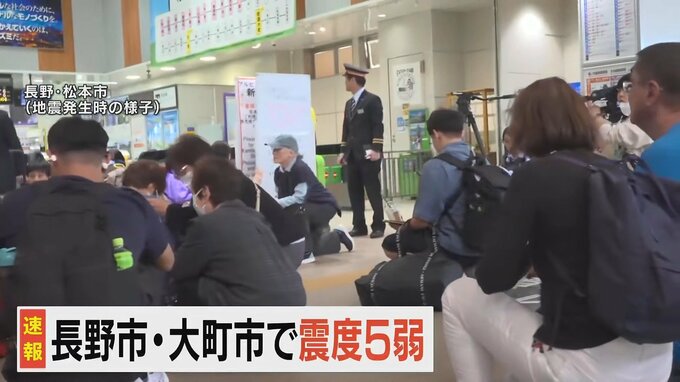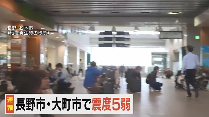 長野県北部で震度5強を観測した地震で、JR松本駅では地震発生直後、突然の地震に驚きしゃがみ込む観光客などの姿が見られました。