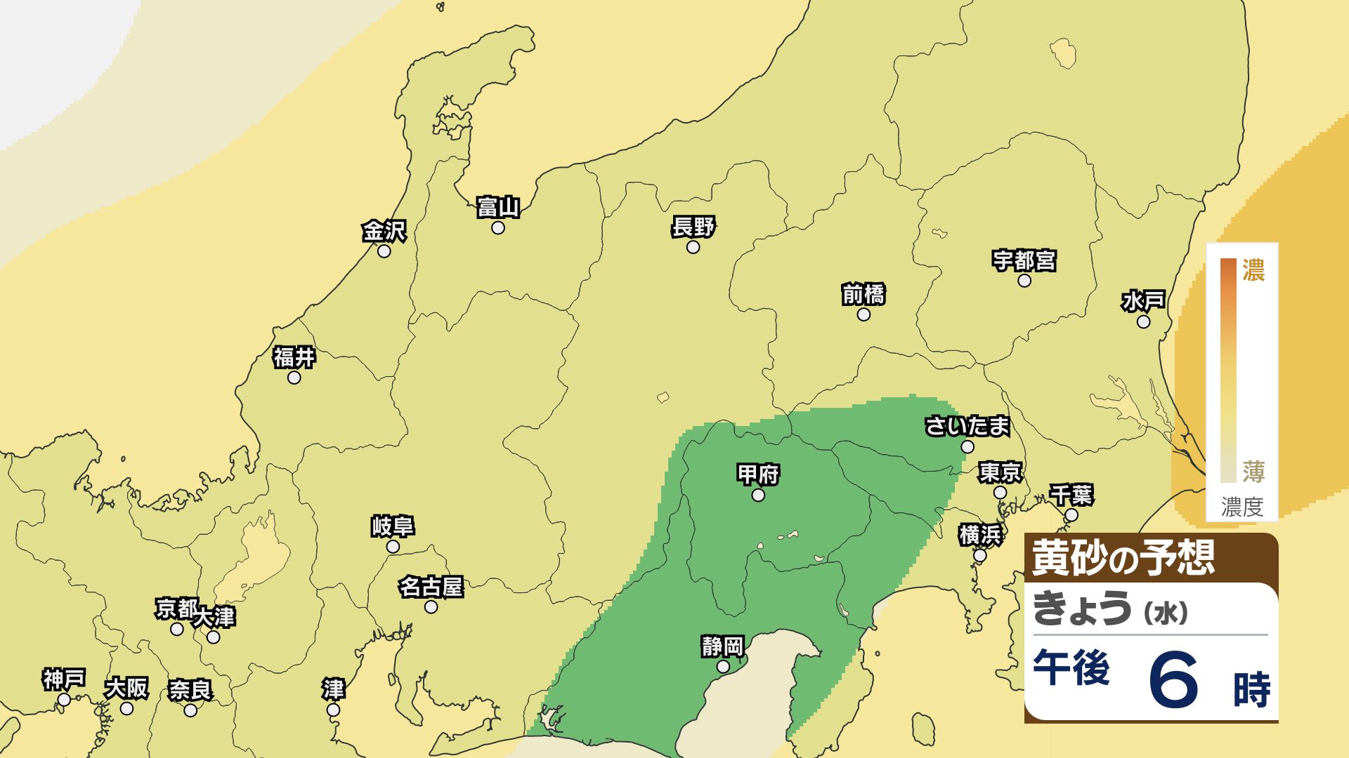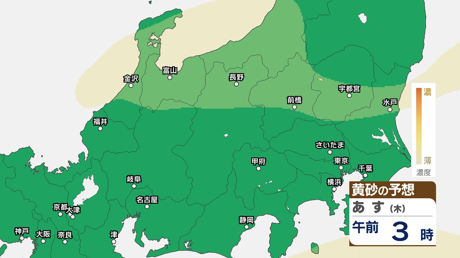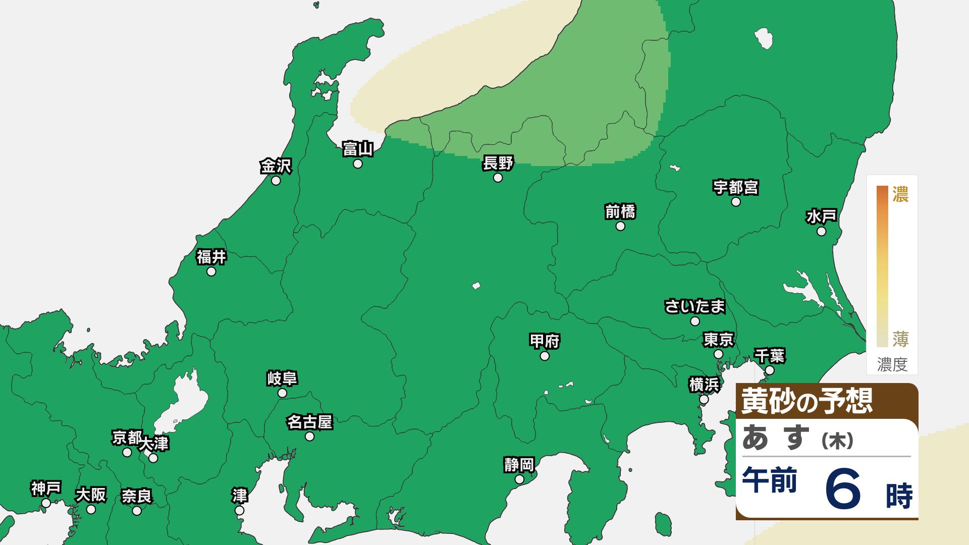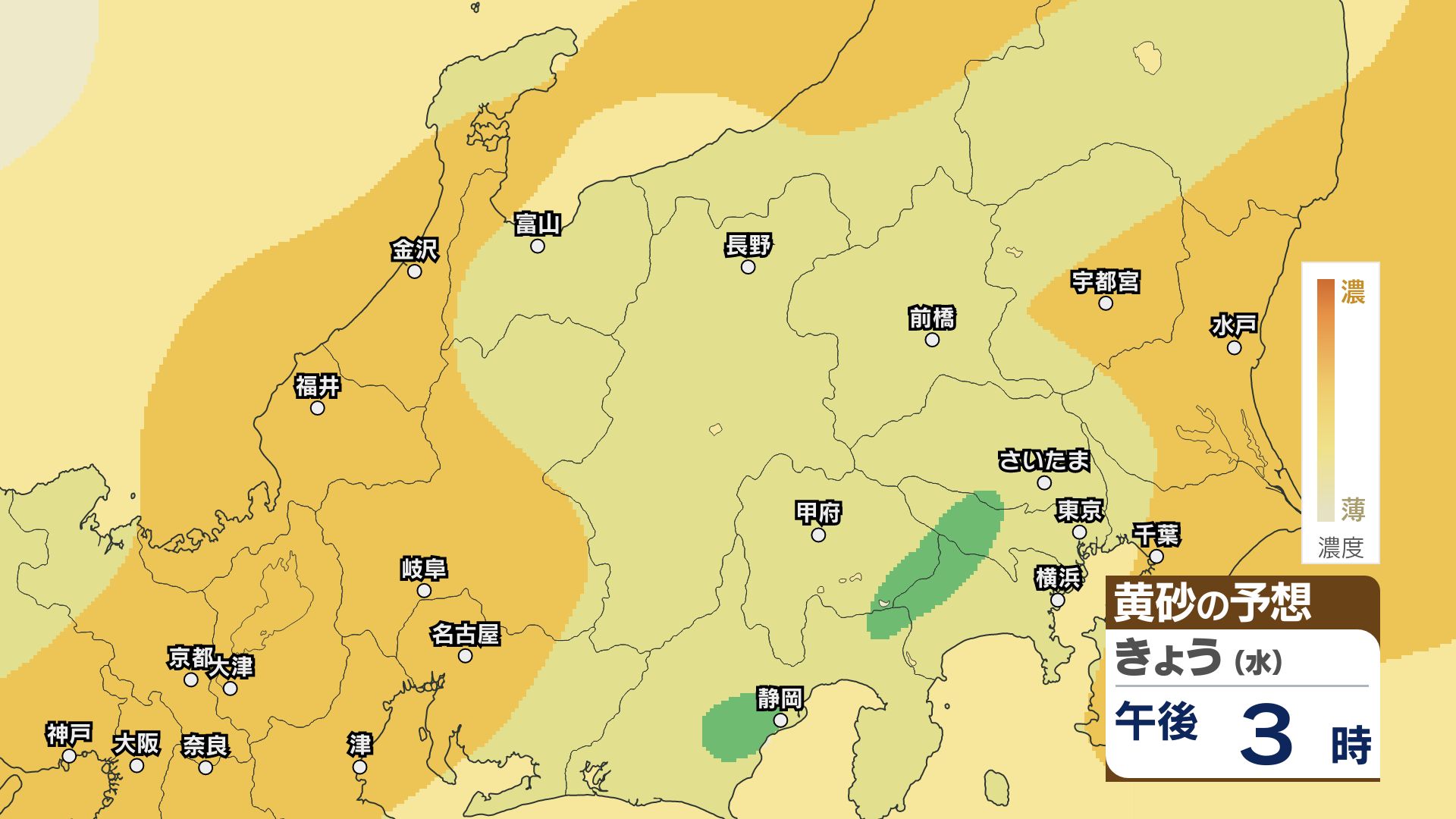 【黄砂情報】関東甲信はあす23日朝頃まで注意必要か【黄砂のシミュレーション】洗濯物の外干しなどに注意 2026年4月22日(水) 11:49 国内 22日は関東甲信地方をはじめ北日本~西日本にかけて黄砂が予想されています。 黄砂の予想シミュレーションによりますと、関東甲信地方ではあす23日朝まで、洗濯物の外干しなどに注意してください。