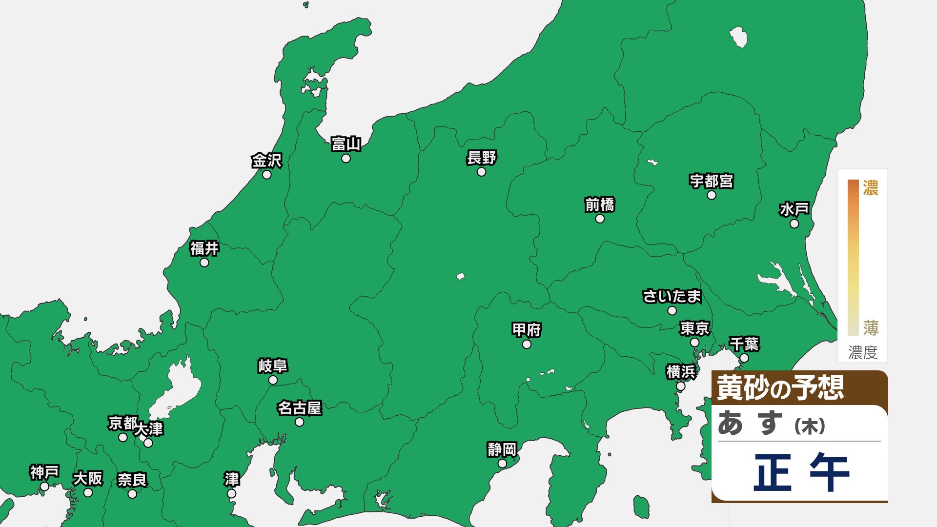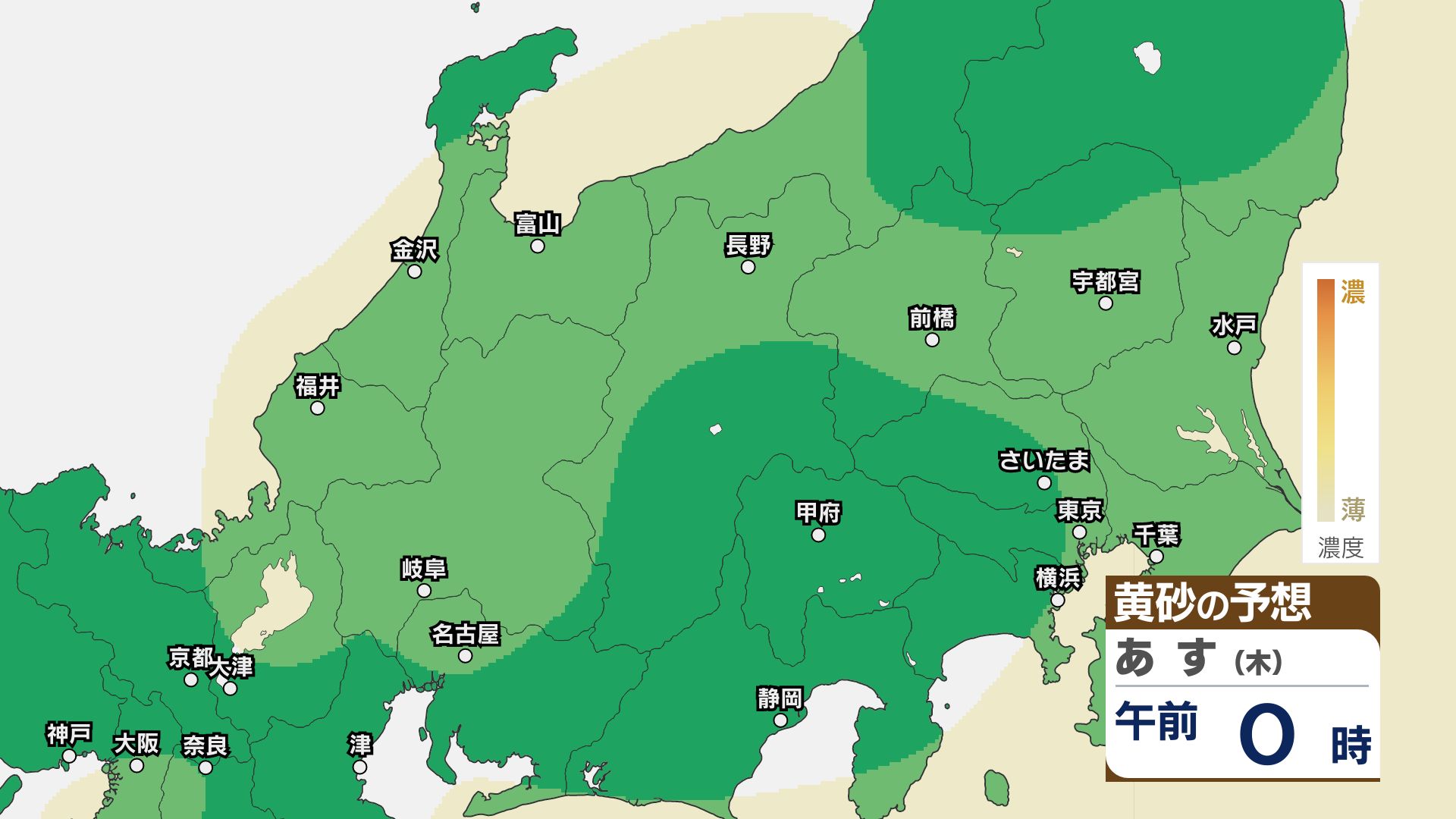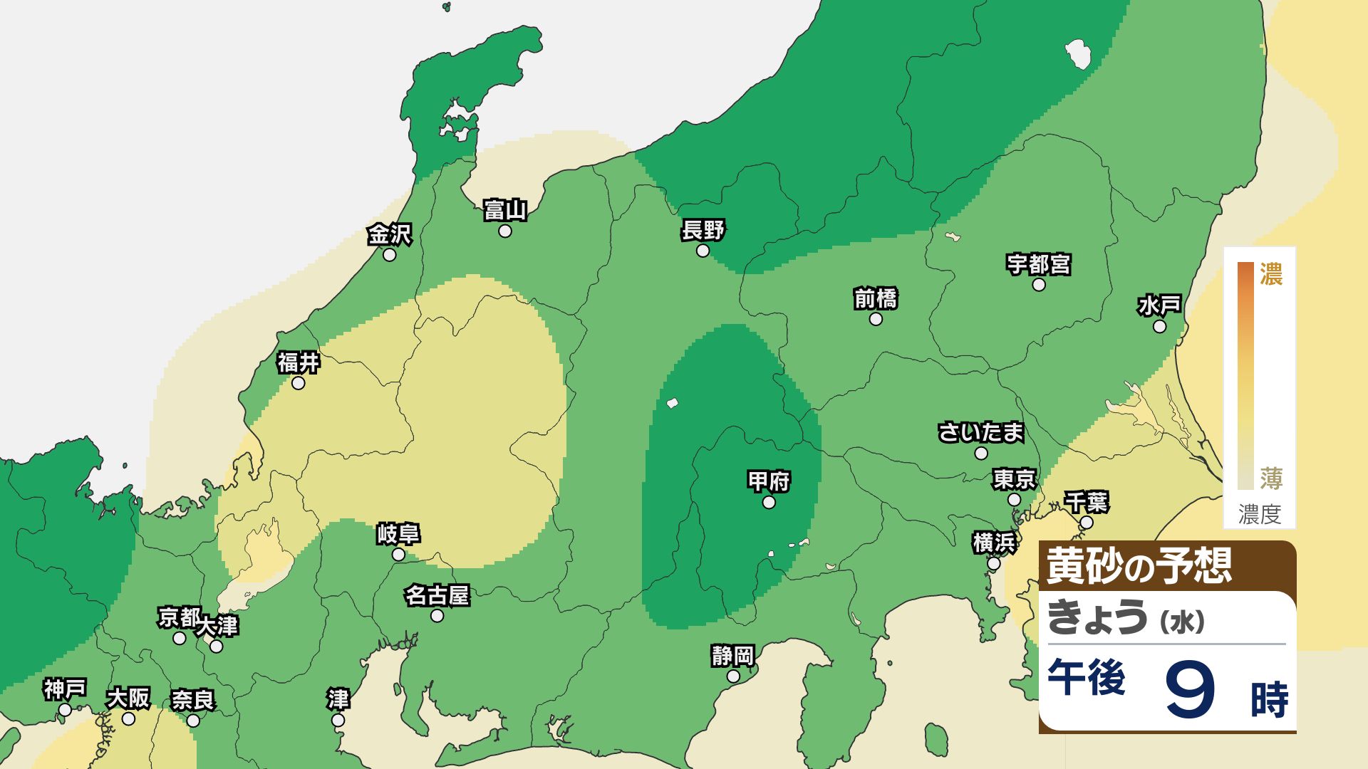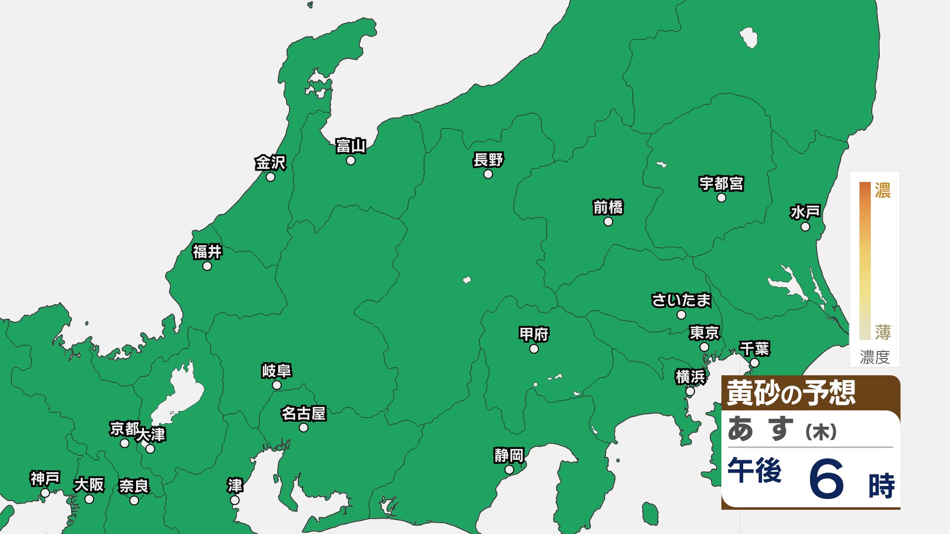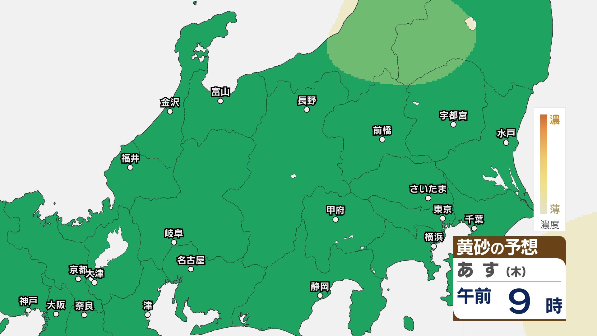 【黄砂情報】関東甲信はあす23日朝頃まで注意必要か【黄砂のシミュレーション】洗濯物の外干しなどに注意 2026年4月22日(水) 11:49 国内 22日は関東甲信地方をはじめ北日本~西日本にかけて黄砂が予想されています。 黄砂の予想シミュレーションによりますと、関東甲信地方ではあす23日朝まで、洗濯物の外干しなどに注意してください。