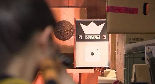 長野市篠ノ井の山林。しばらく進むと、現われた建物。この中で行われているのが…ビーム射撃です。光センサーを使った専用の銃で10メートル先の的を狙います。種目はライフルとピストルの2種類です。