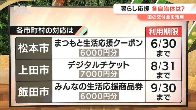 国の交付金を活用した自治体の取り組みでは、松本市では、3月から「まつもと生活応援クーポン」という6000円分のクーポンを配布しています。利用できるのは、6月30日までです。