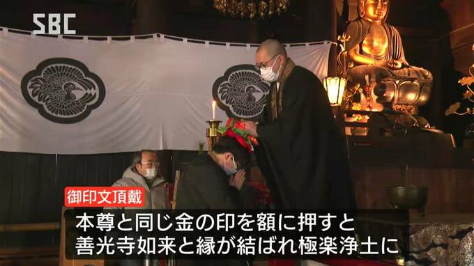 善光寺の恒例行事「御印文頂戴」善光寺如来との縁が結ばれて…「健康でいられますように…」 長野市 2023年1月11日(水) 12:10 国内 長野市の善光寺ではこの時期、恒例の行事・御印文頂戴(ごいんもんちょうだい)が行われました。善光寺の本堂で行われている御印文頂戴は、御開帳を除くと1年の中でもこの時期だけの伝統行事。本尊と同じ金で作ら…