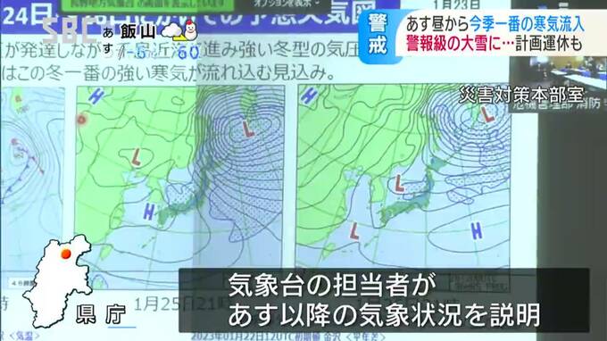 県と市町村などが開いた会議では、気象台の担当者が24日から本州の上空に流れ込むこの冬一番の寒気について説明しました。
