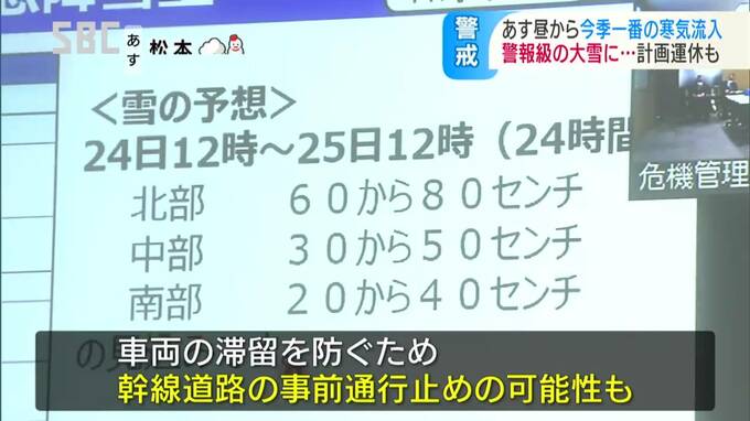 24日から予想される今シーズン一番の大雪を前に、長野県と市町村などが対応を確認しました。すでに一部の鉄道では24日の計画運休を発表しています。