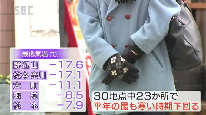 南牧村野辺山で氷点下17.6度…冬型の気圧配置で県内各地で冷え込み強まる 長野 2023年2月16日(木) 10:51 国内 16日朝の長野県内は冷え込みが強まり、各地で最低気温が最も寒い時期を下回りました。氷点下5.2度まで気温が下がった長野市では、厚手のコートやマフラーを身に着け、通勤や通学をする人たちの姿が見られました。…