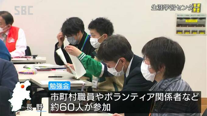 長野市の生涯学習センターで行われている勉強会は県が企画したもので、市町村の職員やボランティアの関係者などおよそ60人が参加しました。