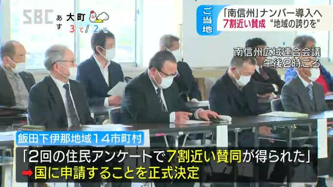 飯田市と下伊那地域のあわせて14の市町村でつくる広域連合は17日、2回の住民アンケートで7割近い賛同が得られたとして、「南信州」ナンバー導入に向けて国に申請することを正式に決定しました。