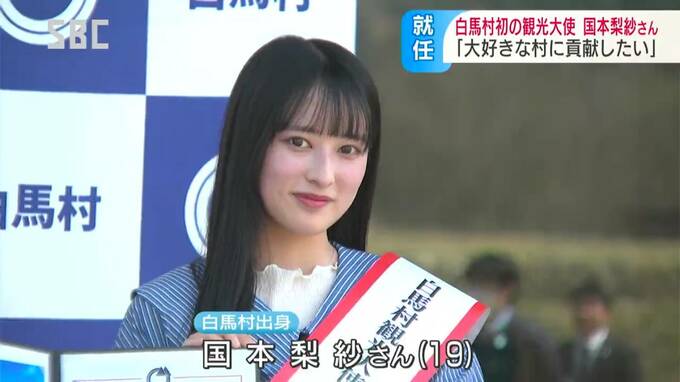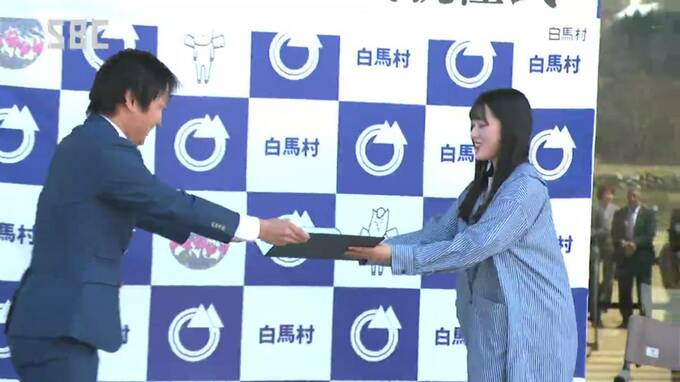 白馬村では観光大使の就任式が行われ、村出身でタレントの国本梨紗さんに丸山俊郎(まるやま・としろう)村長から委嘱状が手渡されました。
