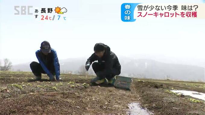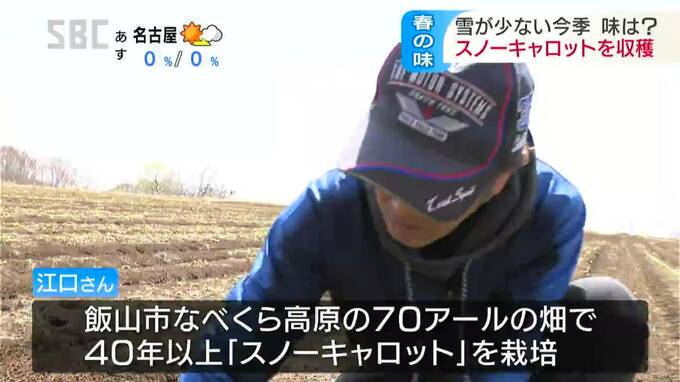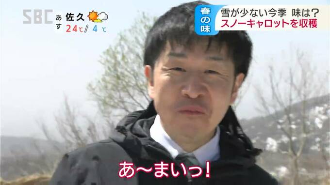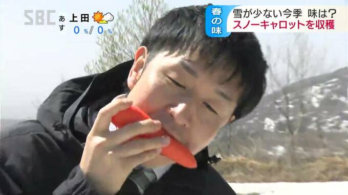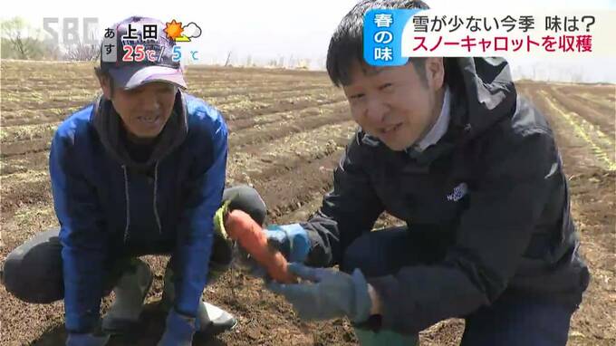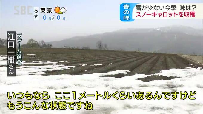 ■宮入キャスター「例年にない暖かさになっています飯山。スノーキャロット畑も、もうこんなに雪がとけています」