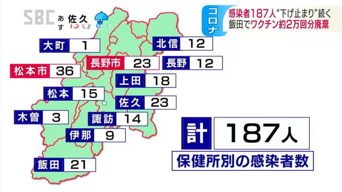 きょう14日に発表があった、県内の新たな感染者はあわせて187人で、保健所別では長野市が23人、松本市が36人、県管轄の佐久保健所が23人、飯田保健所が21人などでした。