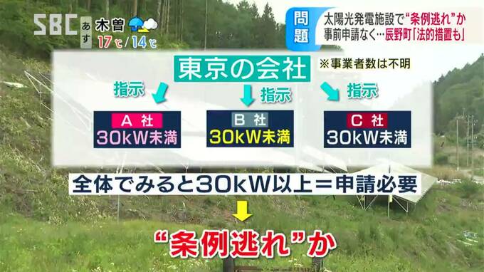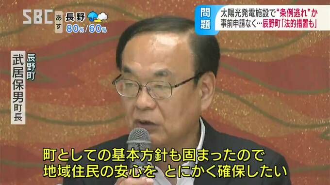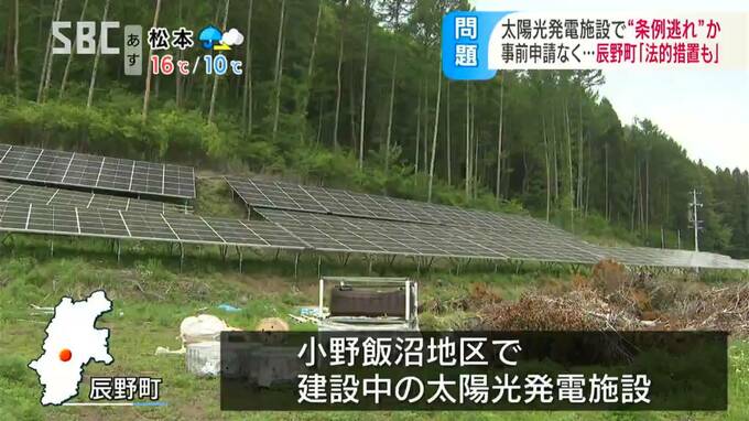 辰野町で、必要な申請がないまま太陽光発電施設の建設が行われていた問題で、町は条例に違反しているとして、事業者の対応によっては法的措置をとる方針を示しました。