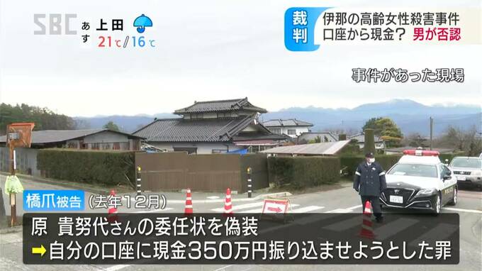起訴状などによりますと、橋爪被告は2022年12月、市内に住む原貴努代(はらきぬよ)さんの委任状を偽装した上で金融機関で原さんの通帳から自分の口座に現金350万円を振り込ませようとしたとされています。