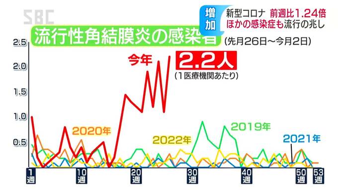 県内の1医療機関当たりの角結膜炎(かくけつまくえん)の患者の数は、前の週は平均2.2人となり、ここ数年でみても大幅に増えていることが分かります。
