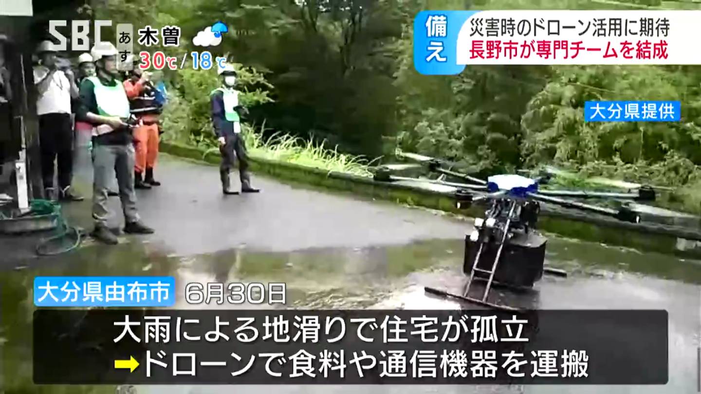 大分県由布市(ゆふし)では大雨による地滑りで住宅が孤立した際、ドローンで食料や通信機器を運搬。