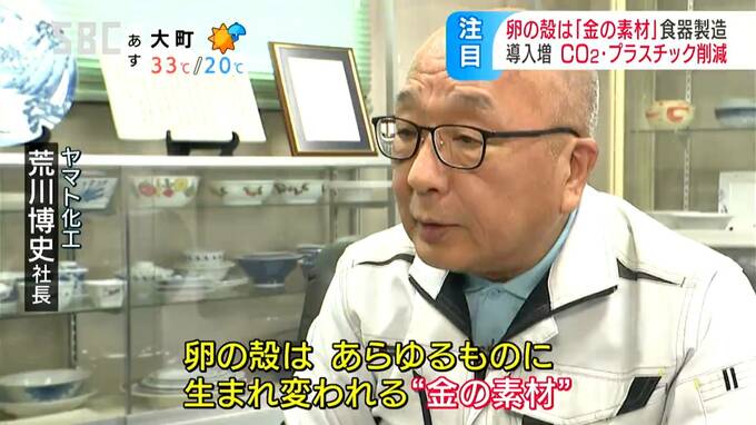 ヤマト化工・荒川博史社長: 「卵の殻はあらゆるものに生まれ変われる金の素材。捨てるだけではもったいない。モノを作る段階でのCO2の削減、またできた製品のCO2の削減、生産にかかわるモノ全て環境に配慮したモノづくり、そういうものを目指していきたいなという思いでこういう素材のものを積極的に使うように取り組んでいます」