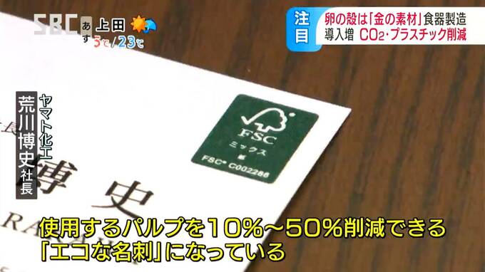 ヤマト化工・荒川博史社長: 「この名刺も卵の殻で出来ている。全く普通の名刺の紙と変わらない感じになっているがこれで使用するパルプを10%から50%削減できるというそういうエコな名刺になってます」