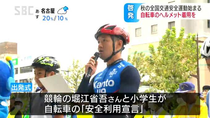 長野県庁で行われた出発式には、警察や県の関係者などおよそ120人が出席し、県内出身の競輪選手・堀江省吾さんと、須坂市高甫(たかほ)小学校の児童が自転車の「安全利用宣言」を行いました。