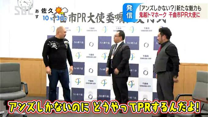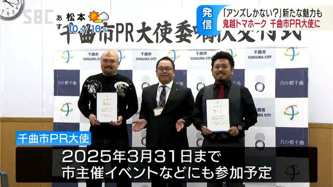 人気お笑い芸人の「鬼越(おにごえ)トマホーク」が千曲市のPR大使を委嘱され、委嘱状の交付式が行われました。