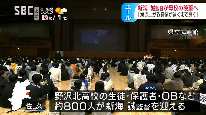 佐久市の県立武道館で、15日、野沢北高校の生徒や保護者、OBなどおよそ800人が新海監督を迎えました。
