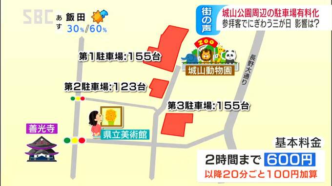 善光寺に近い長野市の城山公園周辺の駐車場が、12月25日から有料となりました。