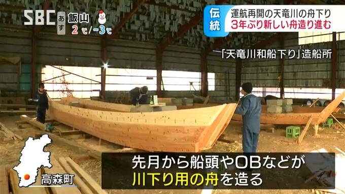 長野県高森町の「天竜川和船下り(わせんくだり)」の造船所では、12月から、船頭やOBなどが川下り用の舟を造っています。