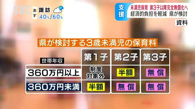 県のこども・家庭課によりますと、子育て世帯の経済的な負担を軽減するため、県は、3歳未満の子どもの保育料について、早ければ2024年4月にも、年収360万円以上の世帯で第3子以降は無償に、第2子も半額にする方向で検討しています。