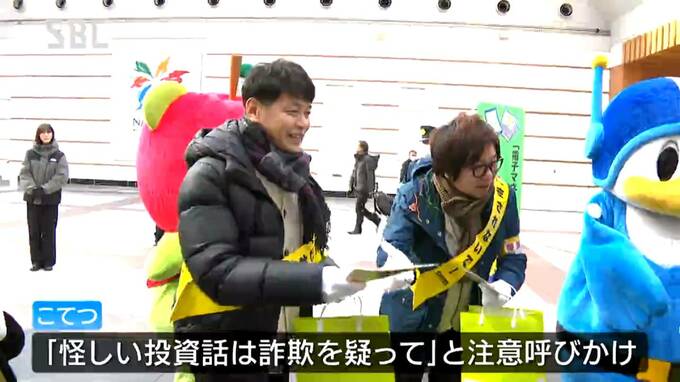 こてつの2人はJR長野駅前でティッシュやチラシを配り、「怪しい投資話は詐欺を疑って」と注意を呼びかけました。