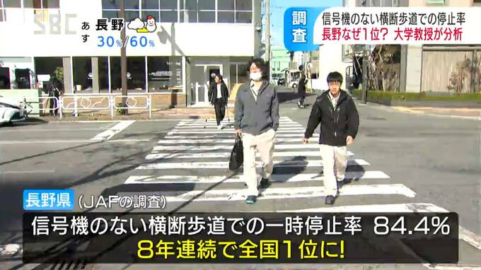 ニュースワイド特集 信号機のない横断歩道「車の停止率」全国No.1のワケは…?大学教授の分析で分かった信州人の「かもしれない意識」って何?教授「信州を訪れて停止率の高さを実感してみたら…」 2024年1月21日(日) 16:00 国内 JAFの調査で、信号機のない横断歩道での車の停止率が、長野県が全国1位というニュースをニュースワイドでもお伝えしてきました。なぜそこまで停止率が高いのか?2023年の調査でワースト3位だった福井県の大学教授が…