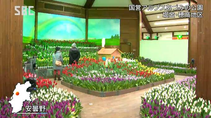 ひと足早く春を感じてもらおうと、長野県安曇野市の公園で、チューリップが展示されています。