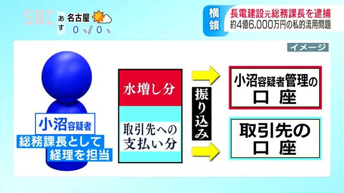 総務課長として会社の預金の管理や取引先への支払いを担当していた小沼容疑者は、取引先への支払いを水増しした金額を、金融機関の窓口で自分が管理する口座に振り込んだとされています。