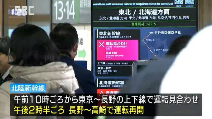午前10時ごろから東京駅と長野駅の間の上下線で運転を見合わせていましたが、午後2時半ごろ、長野・高崎間(かん)で運転を再開しました。