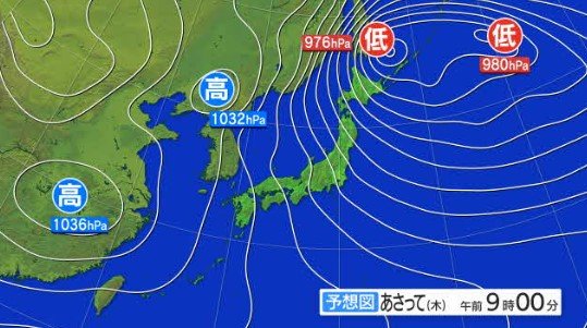 気象台によりますと、日本海北部には発達中の低気圧があって、ゆっくり東に進んでいて、25日にかけて東日本の上空には氷点下36度以下のこの冬一番の強い寒気が流れ込み、強い冬型の気圧配置になりそうです。