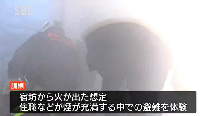 訓練は宿坊から火が出た想定で行われ、住職などが煙が充満する中での避難を体験しました。