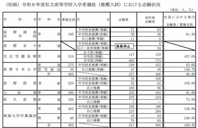 長野女子は24年度から募集を停止しているほか、エクセラン以外の高校では29日までに合格発表が終了しています。
