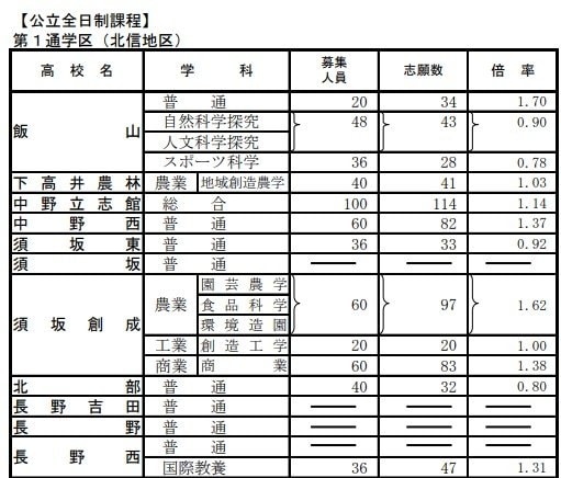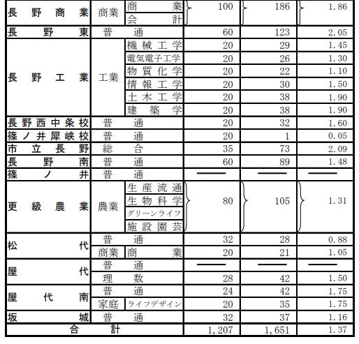 学校別では、岡谷東高校の普通科が3.17倍と最も高く、次いで、大町岳陽高校の普通科が2.42倍、上田千曲高校の商業科と食物栄養科が2.30倍となっています。