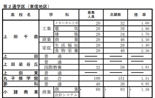 【全校一覧掲載】長野県内公立高校入試前期試験の志願倍率…岡谷東の普通科が3.17倍で最も高く、全日制は5240人の志願で平均1.41倍、大町岳陽普通科2.42倍、上田千曲の商業科と食物栄養科が2.30倍に