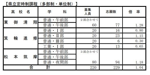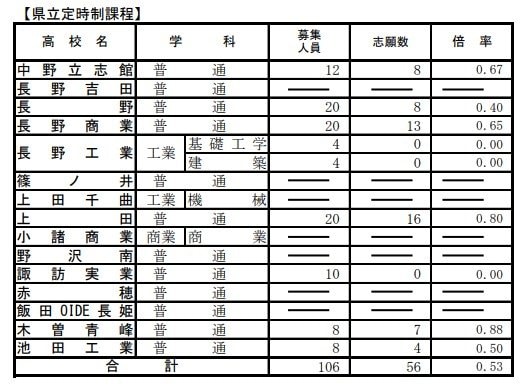 【全校一覧掲載】長野県内公立高校入試前期試験の志願倍率…岡谷東の普通科が3.17倍で最も高く、全日制は5240人の志願で平均1.41倍、大町岳陽普通科2.42倍、上田千曲の商業科と食物栄養科が2.30倍に